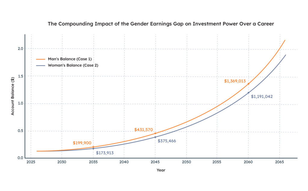 When these earnings gaps are combined with differences in investment participation, the long-term effect on wealth accumulation becomes even more pronounced.